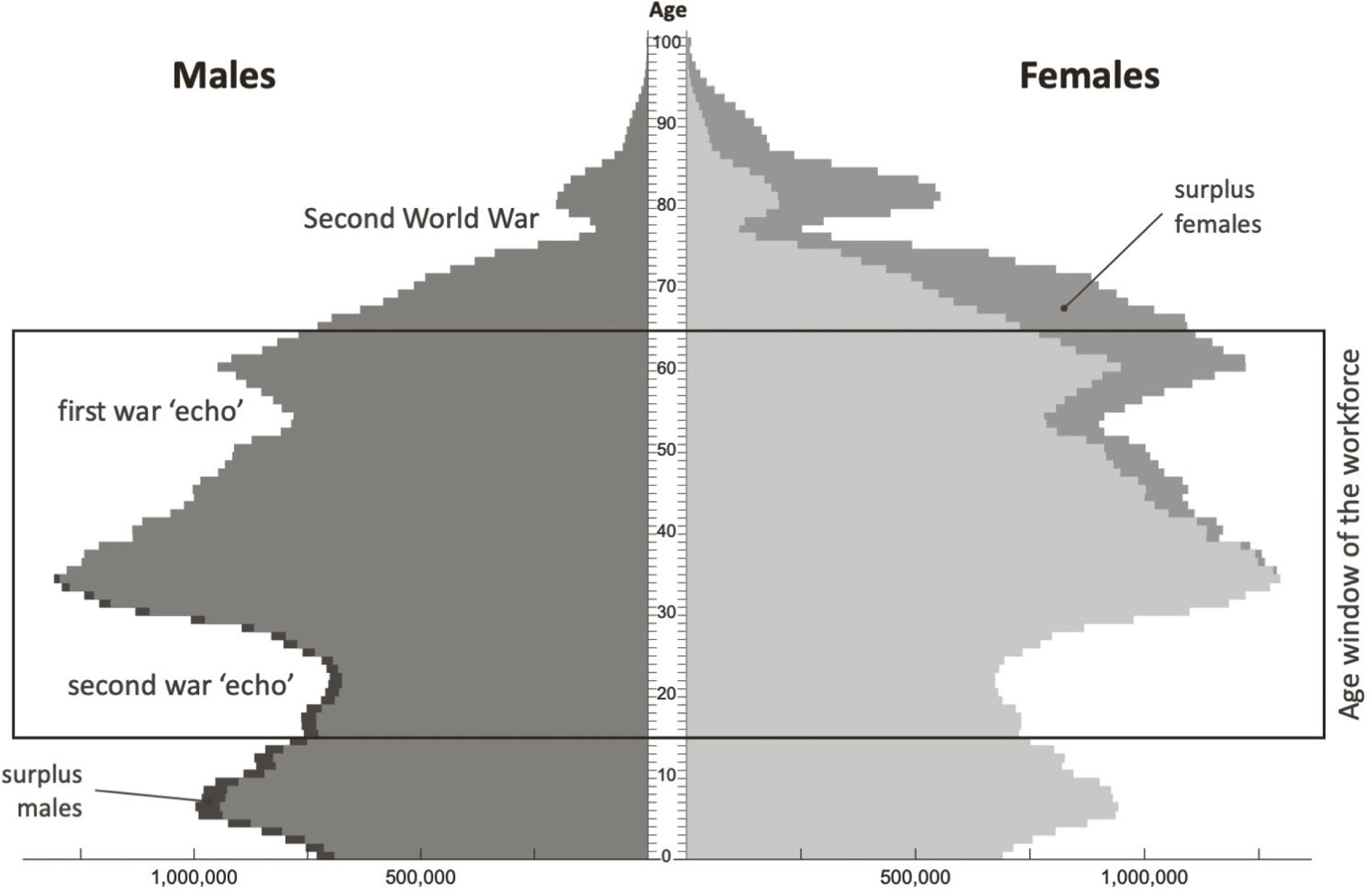 The effects of both the cataclysmic number of deaths and the falling birth rate during the Second World War left an unmistakable imprint on the Russian population pyramid. The bars from the war years are markedly shorter, especially on the left side, where the male population is represented. In fact, the Russian population pyramid today shows a distinct pattern of shorter bars recurring roughly every 25 years – the approximate generation span. These are the demographic echoes of the devastation of the war. It shows that when the greatly reduced cohort of people born during and immediately after the war grew up and had children of their own, fewer children were born around 1968; and they in turn produced reduced numbers of offspring around 1999. The recurring demographic dent broadens each generation due to the spread in the ages at which people reproduce.