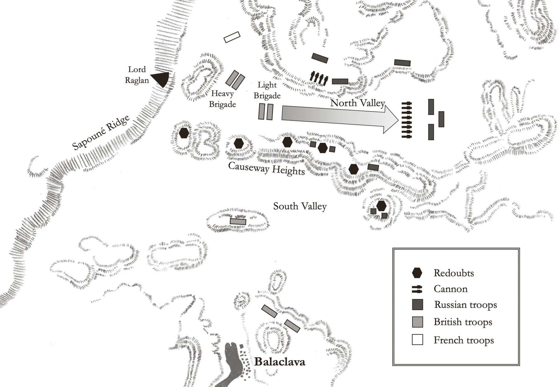 On the morning of 25 October, Russian infantry had overwhelmed three British earthwork forts, or redoubts, positioned along the Causeway Heights, a low range of hillocks that separated two valleys just to the north of Balaclava. The loss of these positions left that vital port and British supply lines dangerously exposed. The British commander in Crimea, Lord Raglan, therefore ordered his cavalry to retake these redoubts and stop the Russians removing the British cannons positioned there. But peering through his telescope, to his abject dismay Raglan watched his Light Brigade of Cavalry instead ride down the length of the north valley and, in a seemingly suicidal frontal assault, charge straight into the heavily defended Russian artillery battery at the end. Man and beast alike were torn apart by the cannons firing point-blank, and after reaching the Russian position, the shredded squadrons were immediately forced to turn around and retreat back down the valley. Within a matter of minutes, over half of the 676 cavalrymen had been killed or wounded, and almost 400 mounts littered the valley floor.